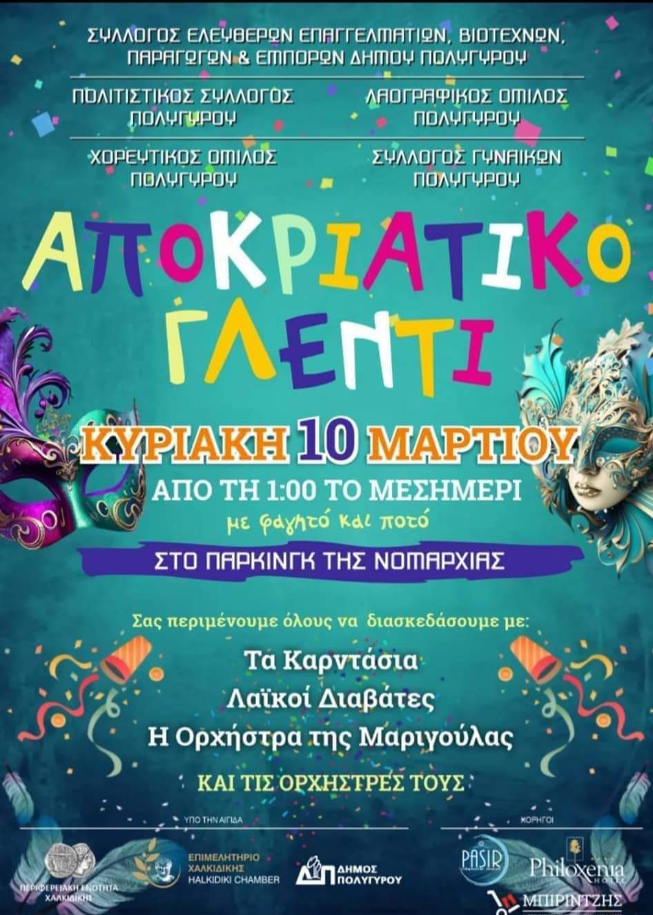 Ένα εξαιρετικό “Αποκριάτικο Γλέντι”, με διοργανωτη τον Συλλογο Ελευθερων επαγγελματιων,βιοτεχνων ,παραγωγων και εμπορων Πολυγυρου Χαλκιδικής και συμμετοχη του Λαογραφικού Ομίλου Πολυγύρου στήθηκε στις 10 Μαρτίου 2024 στην πόλη μας. Ο καιρός μας έκανε τη χάρη κι όλα πήγαν καλά! Διασκεδάσαμε όλοι παρέα, δίνοντας καθαρά Αποκριάτικο τόνο στην πόλη, η οποία μπήκε για τα καλά σε καρναβαλικούς ρυθμούς! Εξάλλου μόνο επιτυχημένο θα μπορούσε να ναι το γλέντι, αφού στήθηκε με τη συμμετοχή πέντε συλλογών της πόλης, αποδεικνύοντας περίτρανα το ” Η ισχύς εν τη ενώσει”.Και του χρόνου.